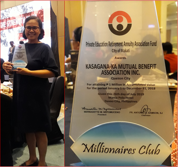KASAGANA-KA Mutual Benefit Associationwas elevated to honorary membership status of the Millionaires’ Club of the Private Education Retirement Annuity Association Fund (PERAA) after attaining over PHP1million in accumulated value of its retirement fund investment as of December 2018.KMBA General Manager Silvida Reyes-Antiquerareceived the citation in a ceremony held in Davao City on 26 July.